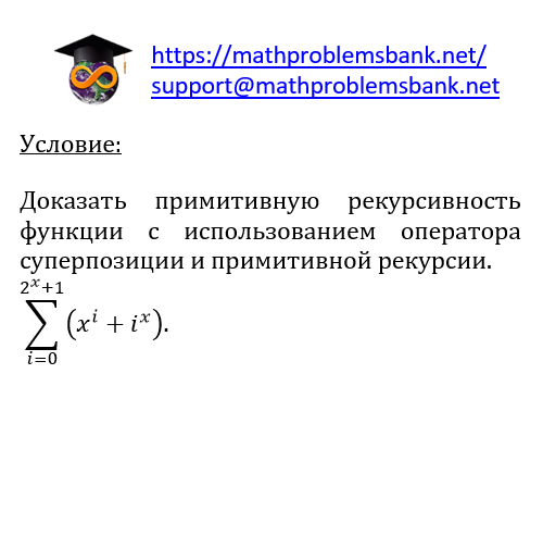 Yсловие: Доказать примитивную рекурсивность функции с использованием оператора суперпозиции и примитивной рекурсии. \[ \sum_{i=0}^{2^{x}+1}\left(x^{i}+i^{x}\right) \text {. } \]